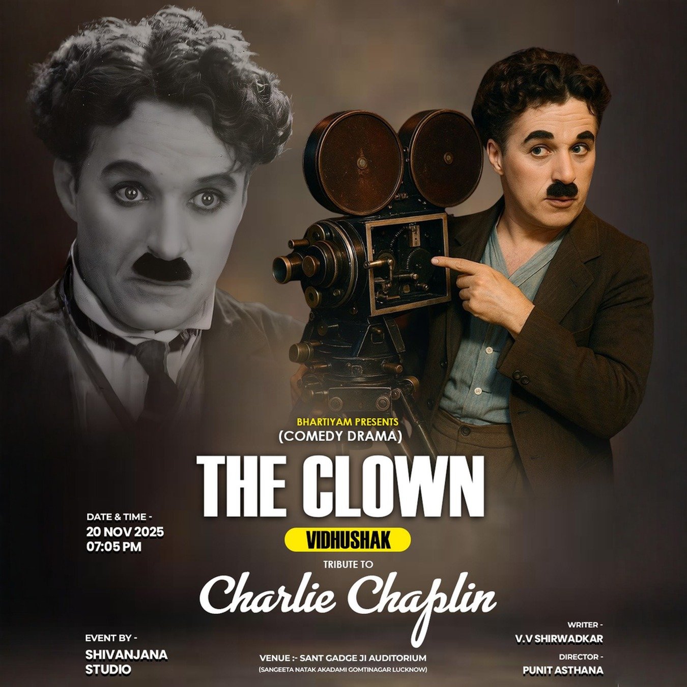 Shivanjana Studio, in association with Bhartiyam, proudly presents The Clown – a theatrical tribute to the timeless genius of Charlie Chaplin. This play brings to life Chaplin's unique blend of comedy, pathos, and storytelling that captivated hearts across generations.